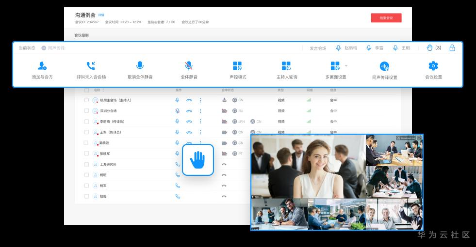 华为云会议支持会议画面灵活布局,让重要的人永居C位;支持全体静音还可以实时定位发言人,实现会前、会中高效管理会议秩序。