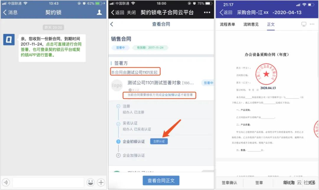 经销商管理系统通过接入契约锁电子签章平台,为企业和经销商对接过程提供真实身份认证、电子签章以及数据存证服务,各类经销商合作协议、销售合同、订单、对账单只需借助经销商管理系统,通过微信公众号窗口就能高效实现发起、消息接收、电子签署。