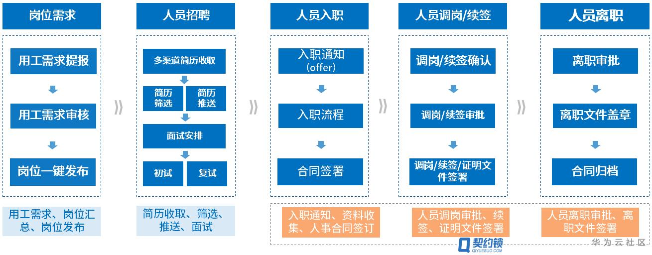 通过集成HRM人事管理系统,可以帮助企业围绕人事管理周期,对各类“入职、在职、调岗、离职”要签文件提供电子印章、电子签名,HR通过人事管理系统就能和员工新签、续签合同,员工证明文件在线审批用印,响应快、格式规范,全面优化人事签署成本。