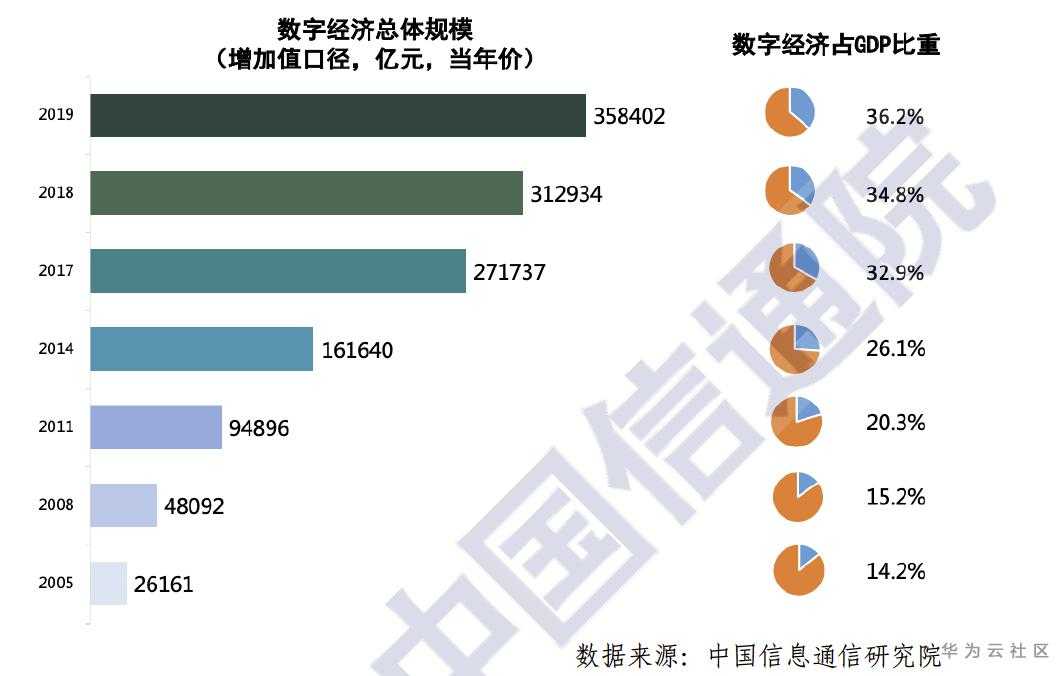 数字经济是未来增长的重点,也是世界经济创新发展的主流模式。据咨询公司IDC的研究显示,到2022年,全球数字经济的比重将达到60%,中国数字经济的比重将达到65%,数字经济总量位居全球第二位。而根据中国信通院报告显示,2019年中国数字经济的比重占GDP达36.2%。这也就意味着,在未来两年中国数字经济比重还将全速翻倍。
