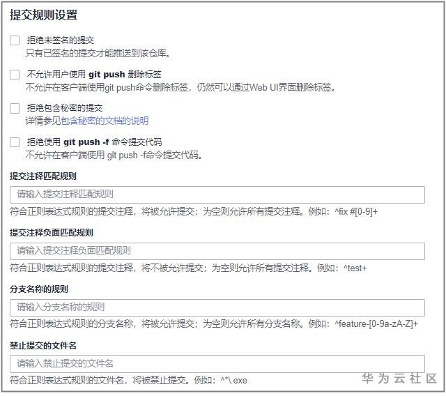 华为云代码托管服务支持对每个仓库设置不同的代码提交规则,保证了中央库的代码规范性,为团队素质建设保驾护航。