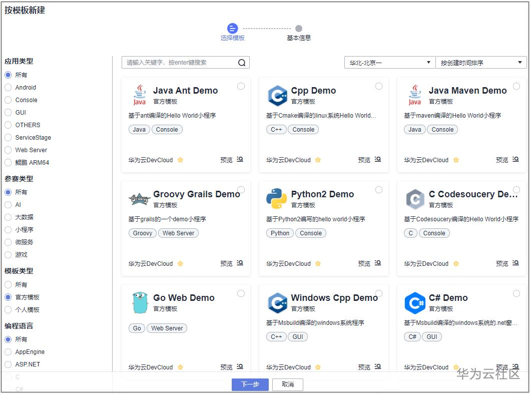 华为云代码托管服务针对不同的开发语言、构建环境,预置了数十个仓库模板,开发者可以使用模板在云端创建仓库,达到快速初始化研发环境的效果。