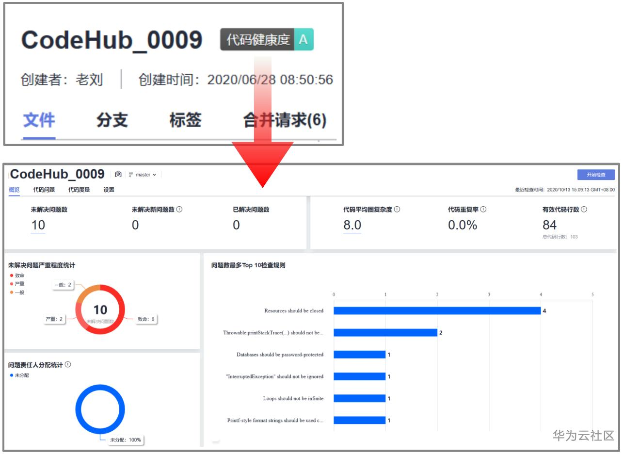华为云代码托管服务会自动识别仓库语言,并生成对应的检查报告。