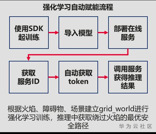 首先,机器狗将感知火焰位置,建立强化学习训练环境,自动上传至obs中。利用ModelArts SDK启动云端强化学习训练,训练机器狗如何找到最优路径灭火。训练结束后将在ModelArts平台导入模型、部署在线推理服务。此时只需要自动获取服务token和API就可以调用在线服务进行推理,获取安全路径,最终控制机器狗绕开火焰灭火。