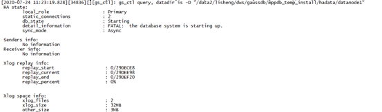DN实例启动过程中,如果期望查看XLOG redo的进度。最方便的是使用gs_ctl query工具对指定DN实例路径进行状态查询,结果中可以显示xlog redo的进度,如图2所示。此外,在DN实例可以接受gsql连接时(启动到最小恢复点之前是拒绝连接的),也可直接在当前DN上执行pg_xlog_replay_completion 函数来获取XLOG redo进度信息。