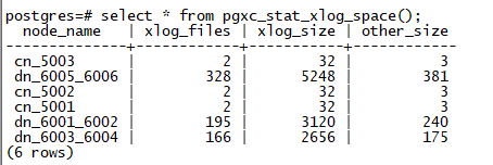 随着数据库的不断运行,产生的日志文件越来越多,如果因为节点故障或其它原因有可能造成日志文件不断积累而充爆磁盘。为了解此使用信息,最方便的是使用gs_ctl query工具对指定DN实例路径进行状态查询,结果中可以显示该实例的XLOG空间使用信息,截图示例请参见上面其它场景。此外,还提供系统函数 pgxc_stat_xlog_space、pg_stat_xlog_space 对数据库集群或单个实例进行查询,例如使用pgxc_stat_xlog_space可以获取到整个集群的CN、主DN的XLOG空间使用信息,如图6所示。
