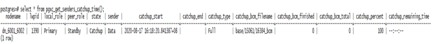 也可以在相应的主DN上执行select * from pg_get_senders_catchup_time可进行当前活跃的主备发送线程的追赶信息显示。完成后,看到的是刚结束的catchup过程信息,如图5所示。