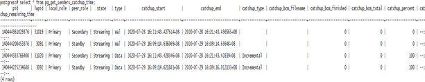 如果期望查看数据页catchup的进度,可以在CN上执行select * from pgxc_get_senders_catchup_time()可进行当前活跃的主备发送线程的追赶信息显示,如图4所示。