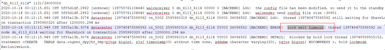 catchup要加7级锁,update与insert加3级锁,3级锁和7级锁冲突,现网一直有大批量的update业务,导致catchup一直在等锁,查看主dn日志有锁超时日志: