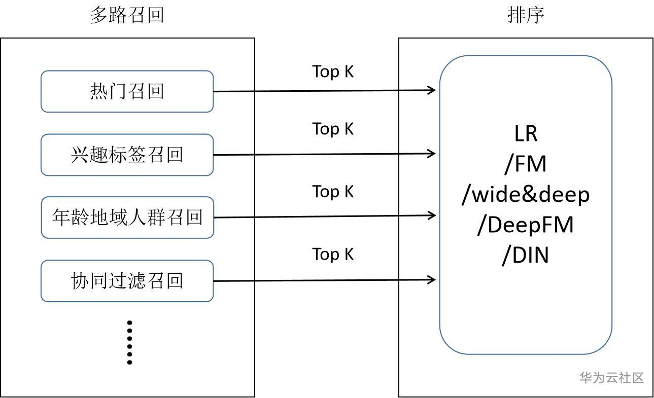 一般经典的召回方法即采用多路召回的方式,如下图所示。