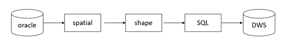 转换流程图如下,oracle中地理数据使用spatial函数处理,这里针对oracle中的地理数据称为spatial类型。迁移过程汇总需要通过工具将spatial数据需要转换为标准格式shape类型,再由shape类型再转换为DWS对应的SQL,最后通过SQL将数据插入DWS中。