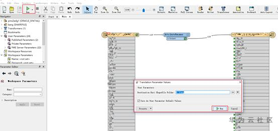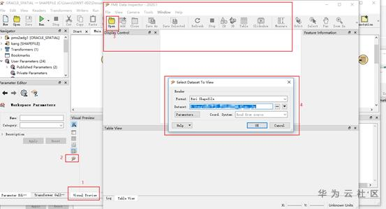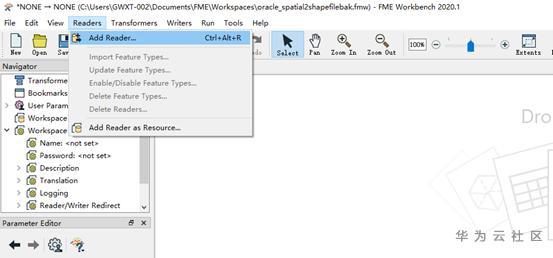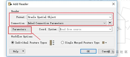 3、 reader中设置format为 “Oracle Spatial Object”,点击Parameter键入链接信息。