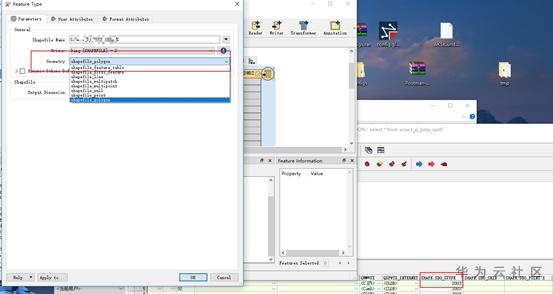 6、 根据表中内容判断数据类型,选择对应类型。这里原表中SHAPE.SDO_GTYPE是2003 对应多边形(具体见附录介绍)。
