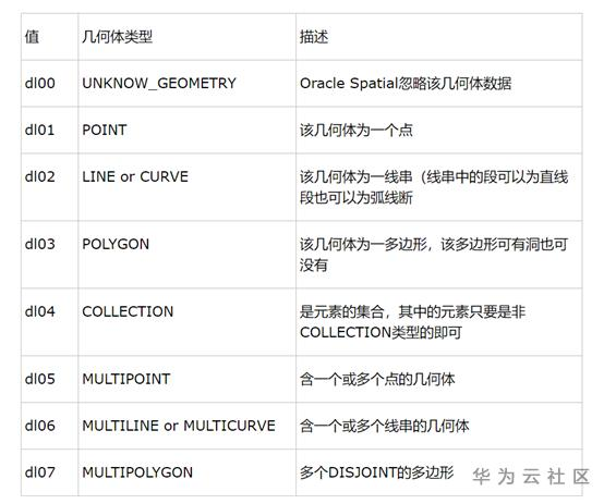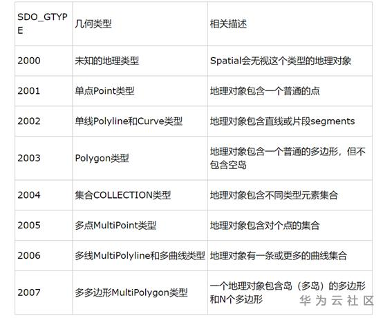 下面就是t=2的二维几何类型,SDO_GTYPE参数值具体如下: