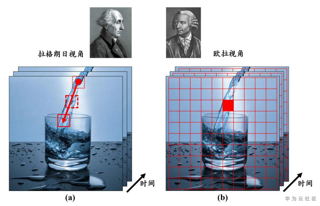图1. 拉格朗日视角与欧拉视角的示意图。(a)拉格朗日视角描述质点本身的流动;(b)欧拉视角描述固定空间点内发生的流体运动