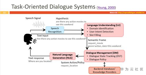 LU模块是将自然语言文本转成机器内部语义表示,主要为了识别出来用户语句中的领域(domain)、意图(intent)和槽(slot);DM模块主要就是根据LU模块得到的结果从而输出一个action,这个action告诉机器人应该去做什么,比如调用服务API或者知识库来得到相关的数据;NLG模块就是要把DM模块得到的数据转成一个用户能够理解的自然语言的描述。