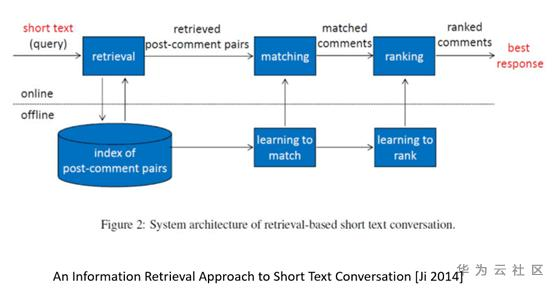 基于检索的模型,主要思想就是构建一个庞大的数据库,里面储存问题和答案对,然后根据用户语句选择一个ranking最高的答案返回给用户,系统结构如下图所示,细节可以参考An Information Retrieval Approach to Short Text Conversation [Ji 2014](https://arxiv.org/abs/1408.6988)这篇论文。