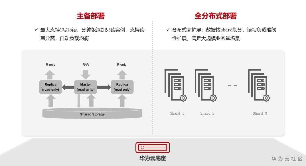 GaussDB(for MySQL)支持两种部署形态:主备和分布式。其中,主备部署最大支持1写15读,分钟级添加只读实例,支持读写分离,自动负载均衡。全分布式部署的数据按shard划分,读写负载准线性扩展,满足大规模业务量场景。