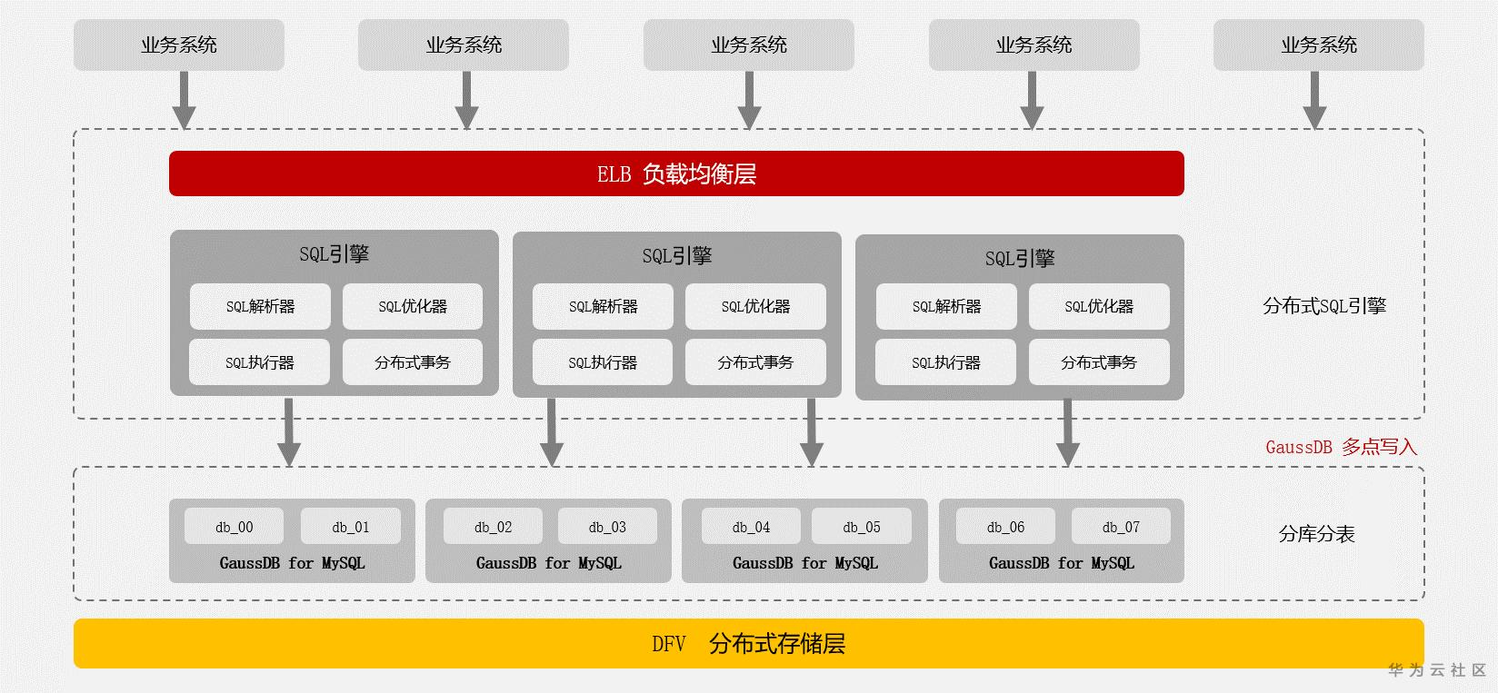 先来看看GaussDB(for MySQL)分布式版本的架构,它采用share nothing架构,融合华为自研分布式SQL引擎和企业级分布式存储DFV双重优势,业务请求通过负载均衡层转发到分布式SQL引擎层,分布式SQL引擎相关的模块对SQL进行解析、分解、路由到各个分片,最后各个分片返回相应结果汇聚返回给用户端。