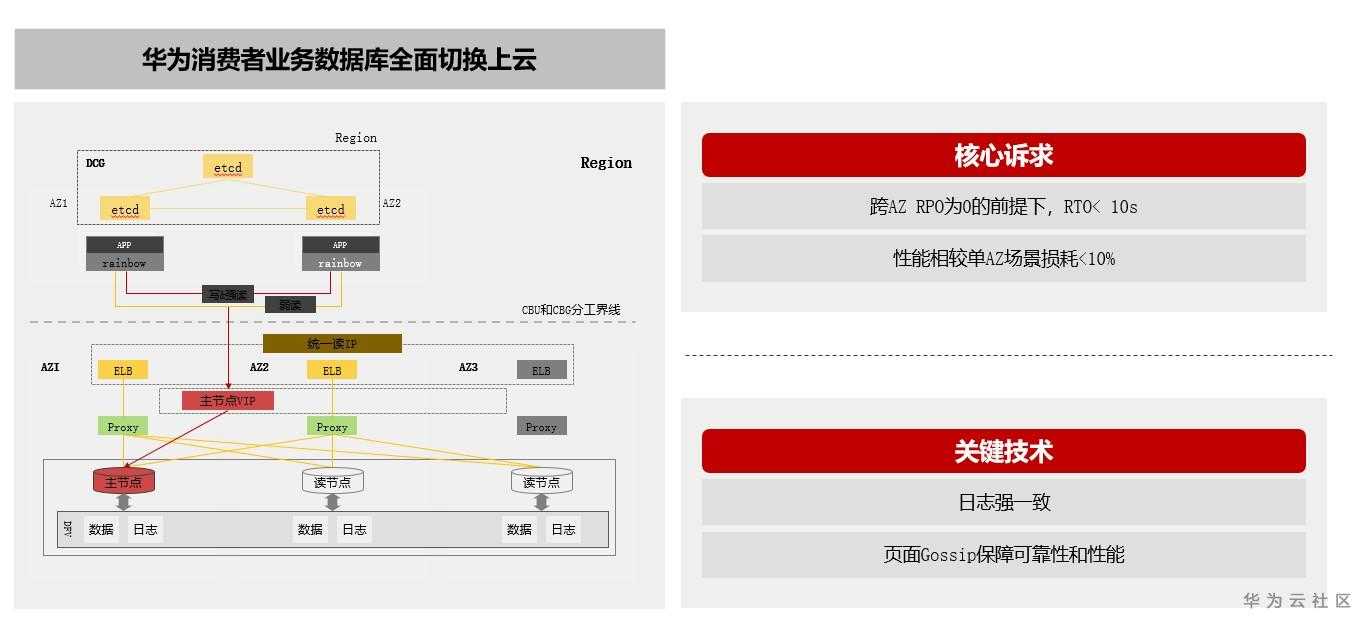 如此庞大的业务,海量数据的存储,超高并发访问都是数据库面临的挑战,比如华为手机相关模块的数据量达到数百个TB级别,并发访问量也高达百万QPS,相关的核心交易系统需要支持跨AZ部署,在跨AZ部署的同时还要求RTO小于10秒。