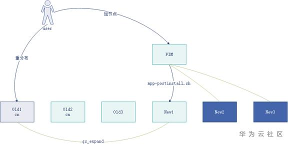 老版本:用户在后台第一个cn节点直接调用gs_expand进行数据重分布;