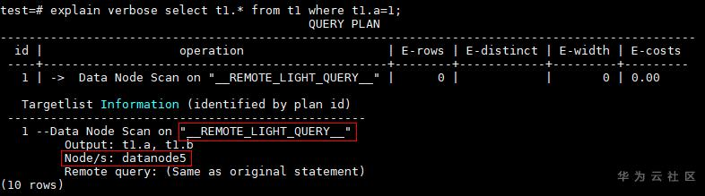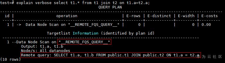 计划解读:因t1.a是表t1的分布列,所以能够匹配上t1.a=1的数据只在某一个DN上,所以这个计划执行相比典型的FQS应该更简单,只在某一个DN上执行即可(例如上面计划所示,只在datanode5执行)。