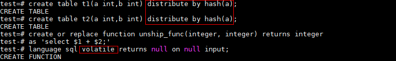 需要注意的是当我们创建自定义函数时,默认的provolatile属性是volatile的, proshippable属性是false,也就是函数默认不下推,如果希望将函数定义为下推函数一定要清楚的理解这两个属性的含义,否则不能下推的函数下推了会导致执行结果的错误。