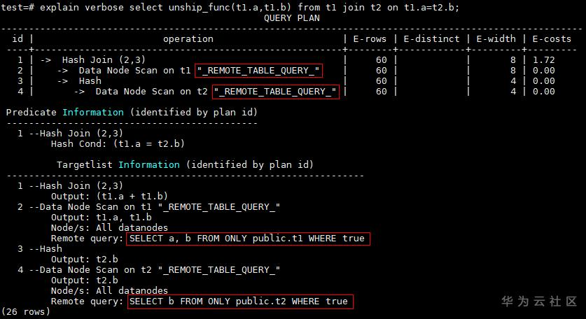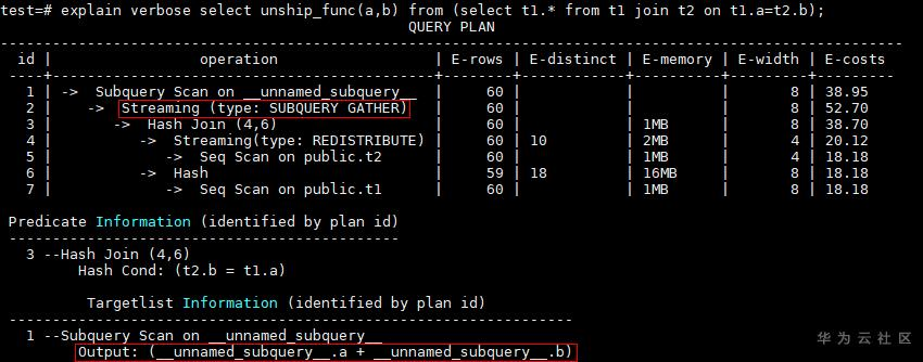 计划解读:unship_func为不能下推的函数,但是from后面的子查询可以下推,这种情况直接把子查询下推到了DN,执行完把数据返回给CN并在CN上调用unship_func计算出最终结果。