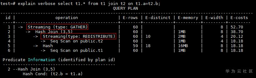 计划解读:join条件中t2.b列不是t2的分布列,所以需要对t2表按照a列做REDISTRIBUTE重分布,才能保证每个DN做join时能获取到所需的t1和t2表的对应数据。