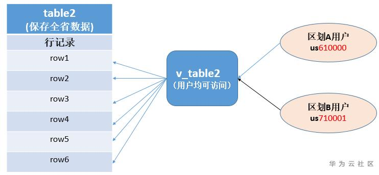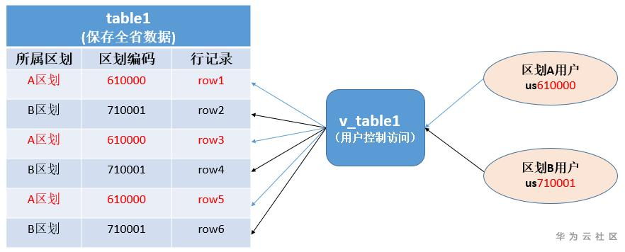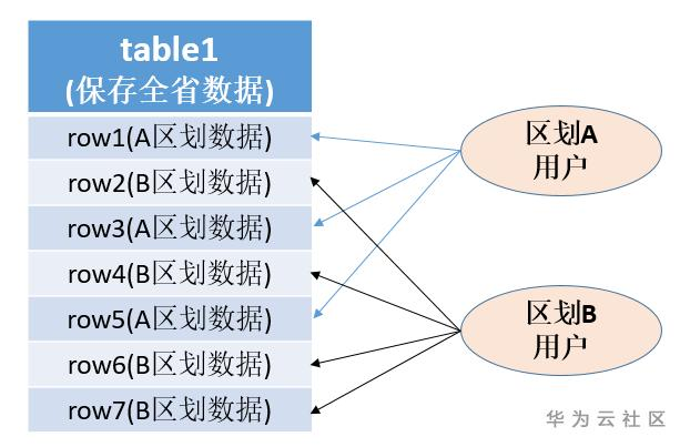 客户需求大致如下图所示,业务表table1保存全省数据,现有区划A用户和区划B两个用户,为实现按区划显示和拆分,需要做到区划A用户仅能看到A区划的数据,例row1、row3、row5,而B区划数据对他不可见,并且能够实现A区划数据的分离提取。