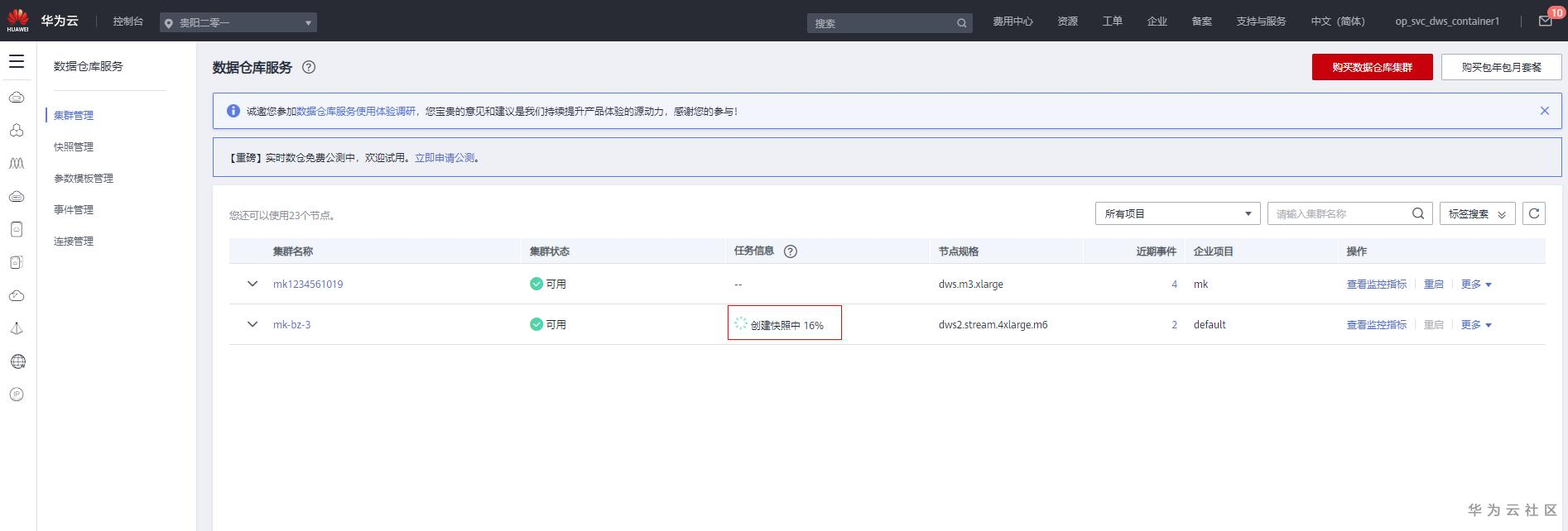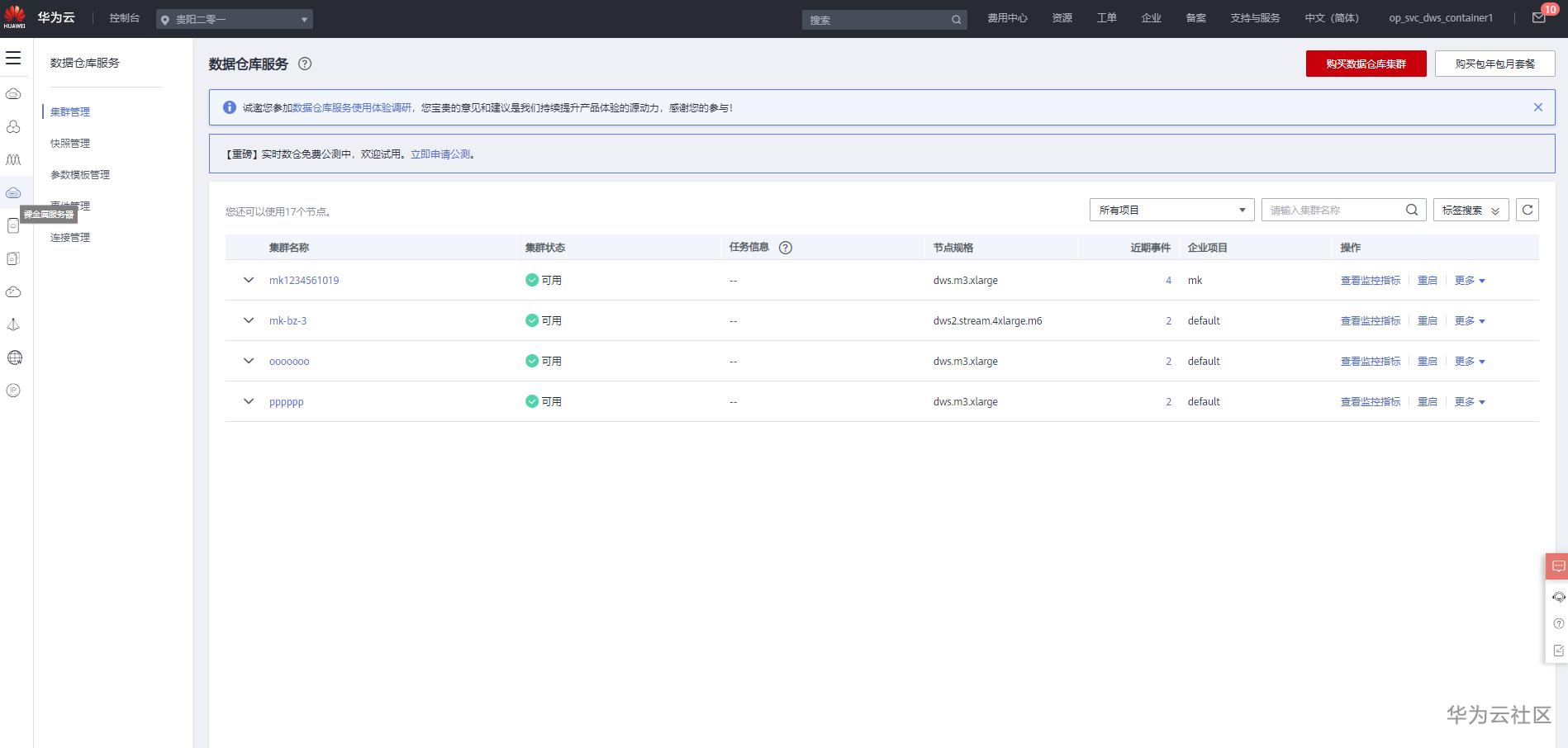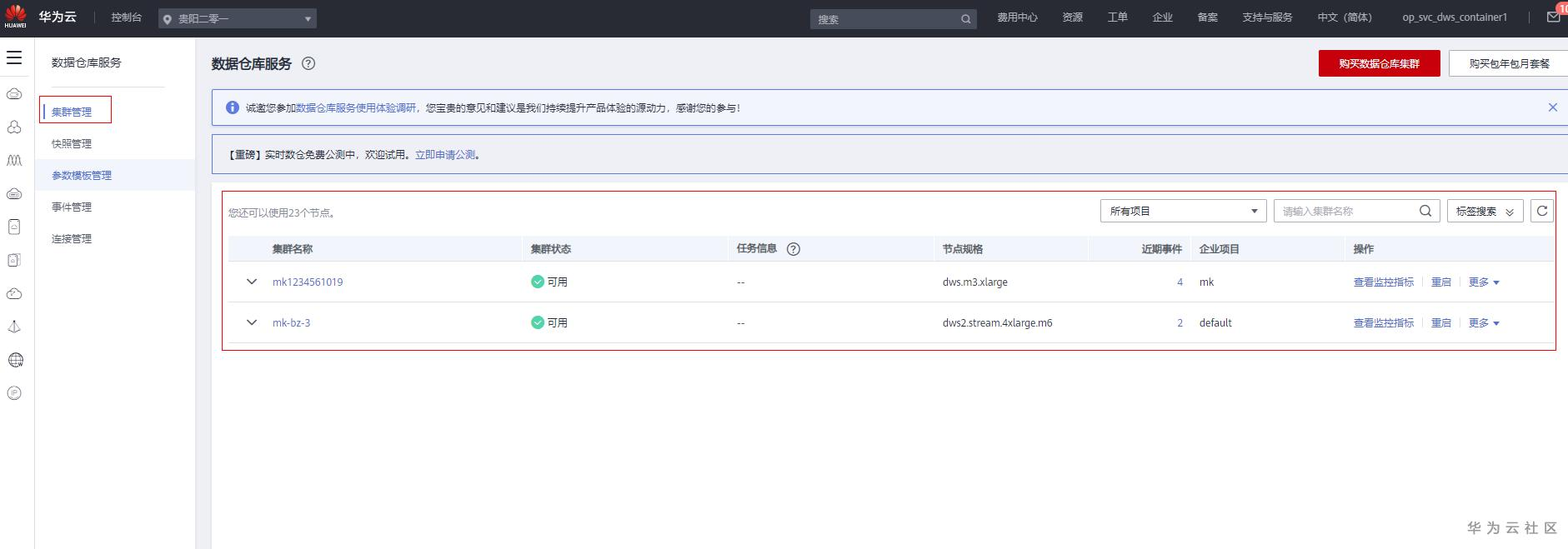 1. 进入控制台页面 https://console.huaweicloud.cn/dws/?region=cn-southwest-1#/dws/management/list