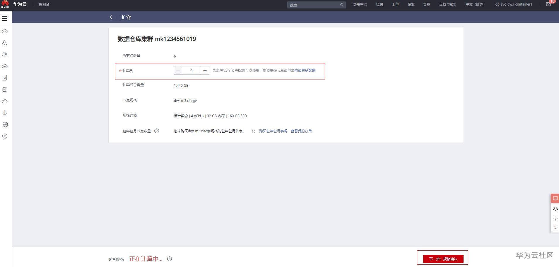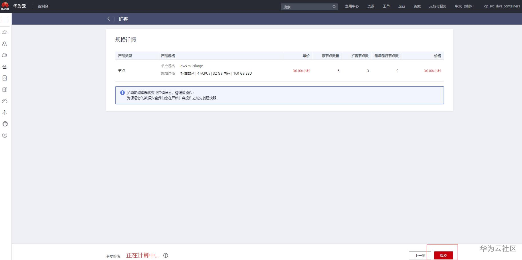 6. 单击“提交”,此界面显示了产品规格、扩容后的节点数量、扩容节点数、单价和总价格。