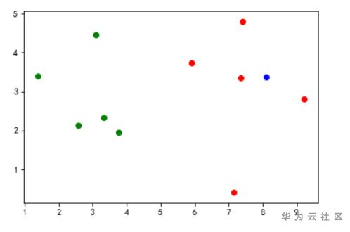 x=np.array([8.093607318,3.365731514]) plt.scatter(X_train[y_train==0,0],X_train[y_train==0,1],color='g') plt.scatter(X_train[y_train==1,0],X_train[y_train==1,1],color='r') plt.scatter(x[0],x[1],color='b') plt.show()