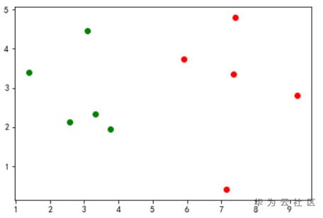 import numpy as np import matplotlib.pyplot as plt #定义特征值 raw_data_x=[[3.3144558 , 2.33542461], [3.75497175, 1.93856648], [1.38327539, 3.38724496], [3.09203999, 4.47090056], [2.58593831, 2.13055653], [7.41206251, 4.80305318], [5.912852 , 3.72918089], [9.21547627, 2.8132231 ], [7.36039738, 3.35043406], [7.13698009, 0.40130301]] #定义目标值 raw_data_y=[0,0,0,0,0,1,1,1,1,1] X_train = np.array(raw_data_x) y_train = np.array(raw_data_y) #利用matplotlib绘制图像 plt.scatter(X_train[y_train==0,0],X_train[y_train==0,1],color='g') plt.scatter(X_train[y_train==1,0],X_train[y_train==1,1],color='r') plt.show()