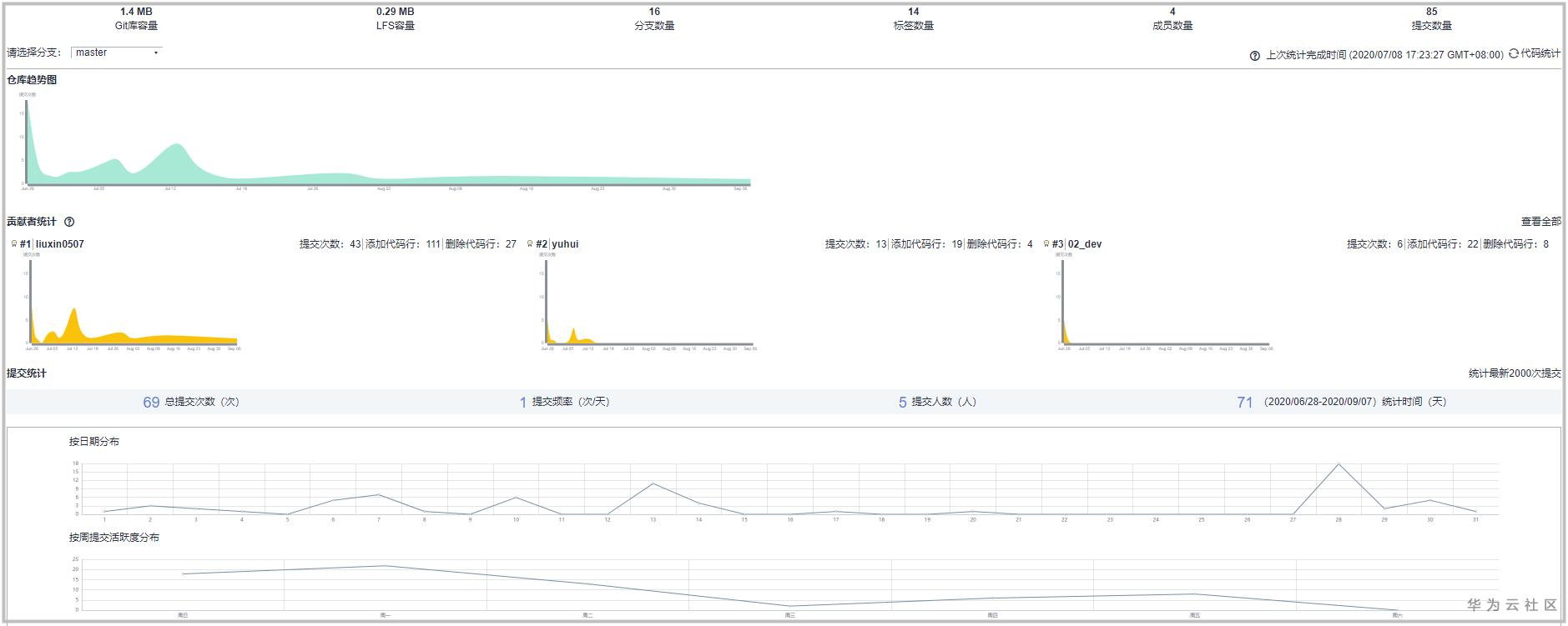 华为云代码托管服务提供了多维度的数据分析报表(代码贡献度统计、仓库语言统计、提交统计、仓里提交网络图等),帮助仓库管理者了解研发工作的推进情况。