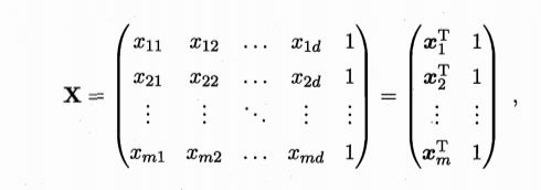 类似的,我们用最小二乘法来对ω,b进行估计,把ω,和b吸收进一个向量形式ω=(ω,b),把数据集D表示成一个m*(d+1)大小的矩阵X,其中每行对应一个示例,该行前d个元素对应示例中的d个属性,最后一个恒唯1,即: