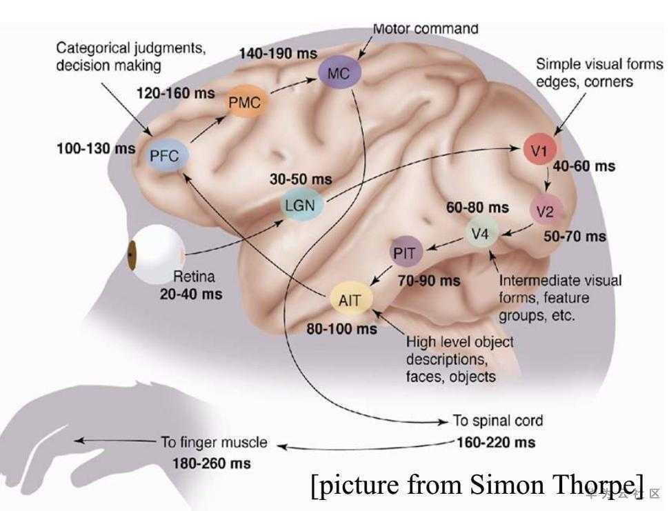 1959-1962年期间,获得了1981年的诺贝尔医学奖的David和Wiesel通过对猫的大脑初级视觉皮层研究发现,初级视觉皮层中不同的神经元对各种空间位置和方向偏好不同,在猫的大脑的初级视觉皮层(V1)中的神经元会响应视觉环境中特定特征的刺激(称之为感受野机制)。后续不断积累的视知觉通路研究表明,动物大脑的视觉皮层具有层次结构。眼睛将看到的景象成像在视网膜上,从视网膜传来的信号首先到达初级视觉皮层(primary visual cortex),即V1皮层,V1皮层简单神经元对一些细节、特定方向的图像信号敏感。V1皮层处理之后将信号传导到V2皮层,V2皮层将边缘和轮廓信息表示成简单形状,然后传递给V4皮层中的神经元进行处理,V4皮层对颜色信息敏感。最终,复杂物体在下颞叶皮层(inferior temporal cortex)被表示出来(图1)。