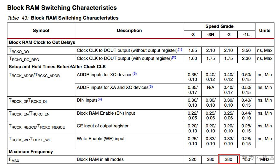 Spartan-6 BRAM的最大工作时钟频率如下图所示。