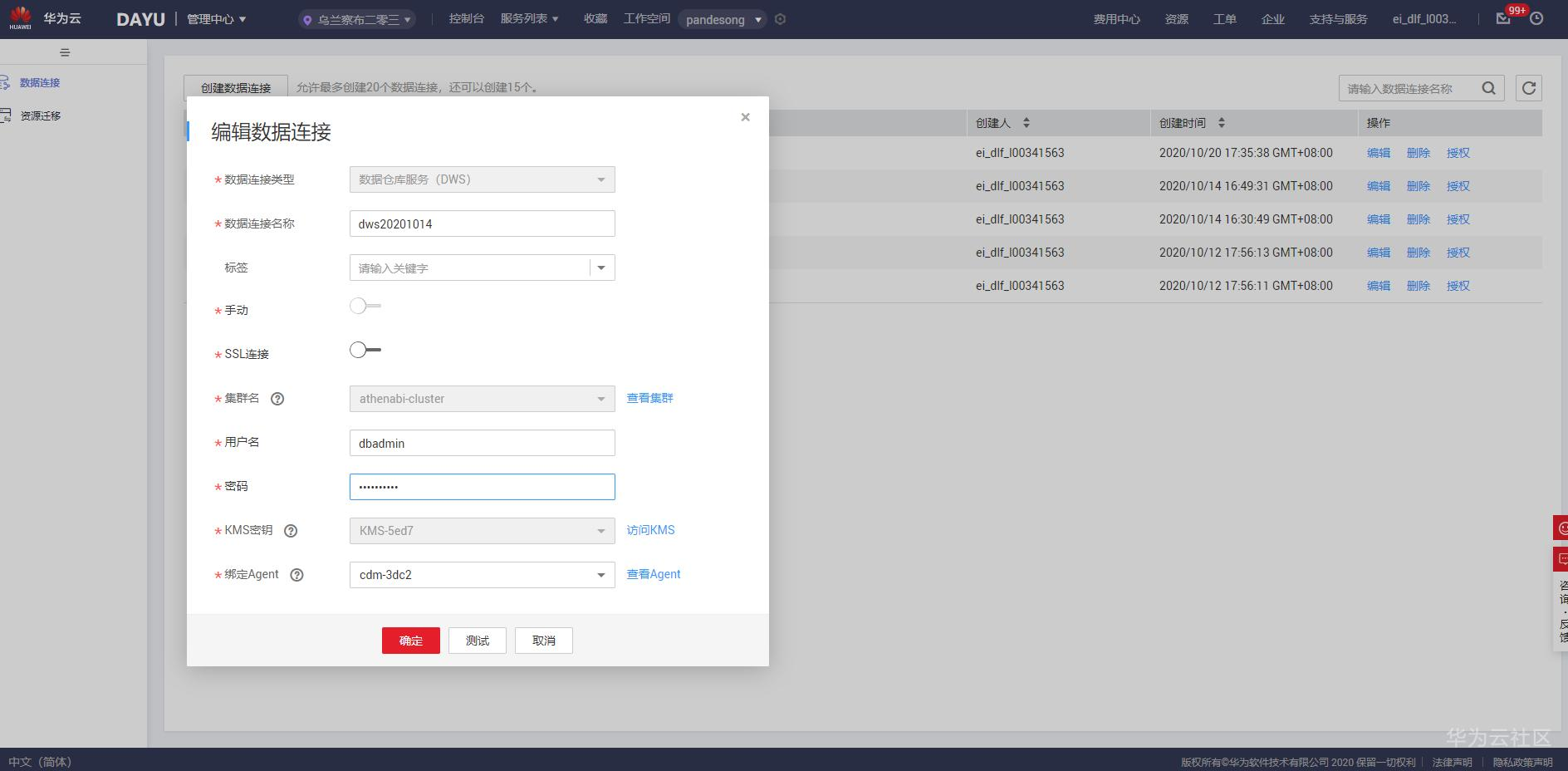 创建DWS数据连接,点击创建数据连接,选择连接类型为DWS,录入dws连接信息,如下图: