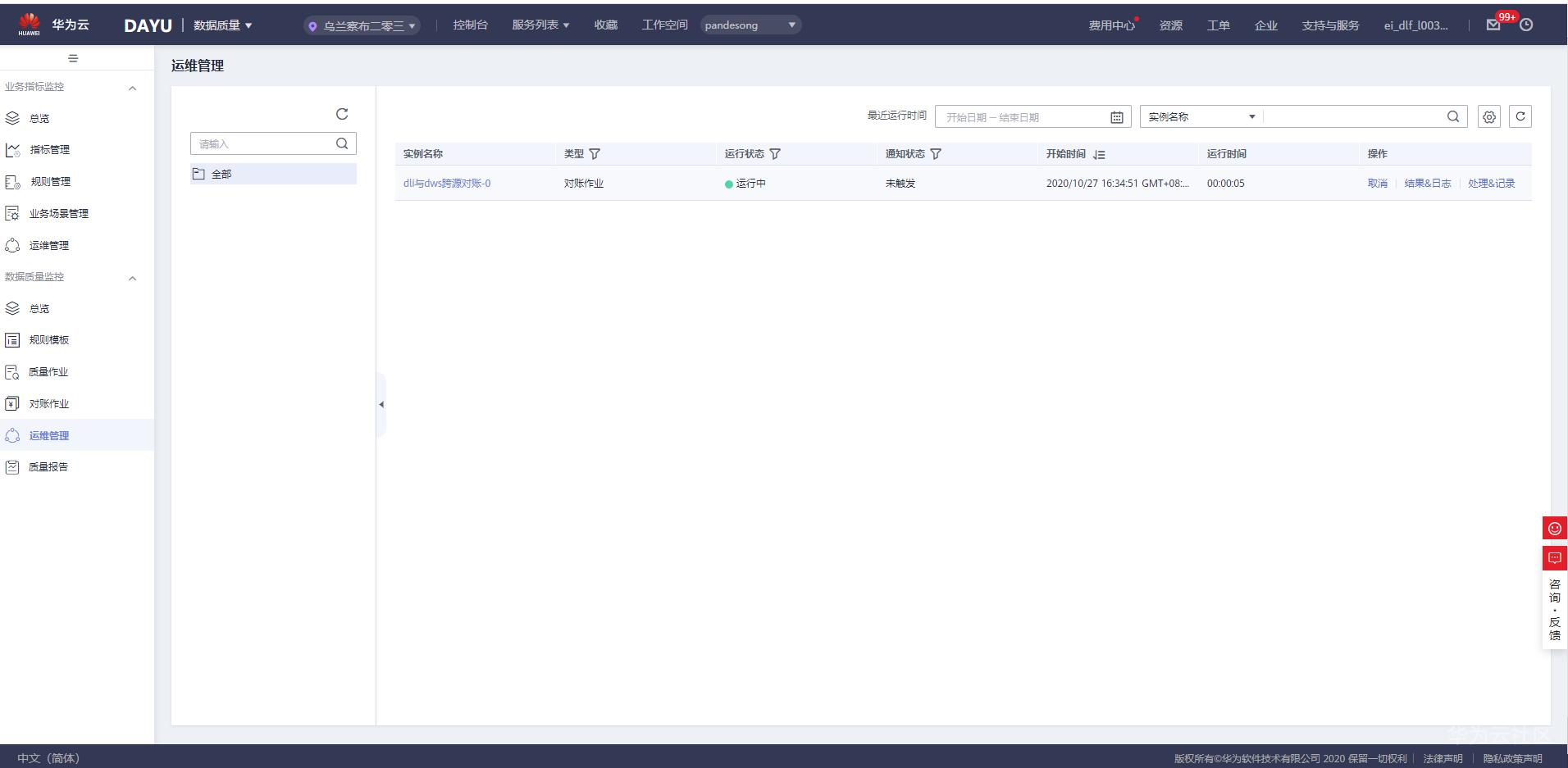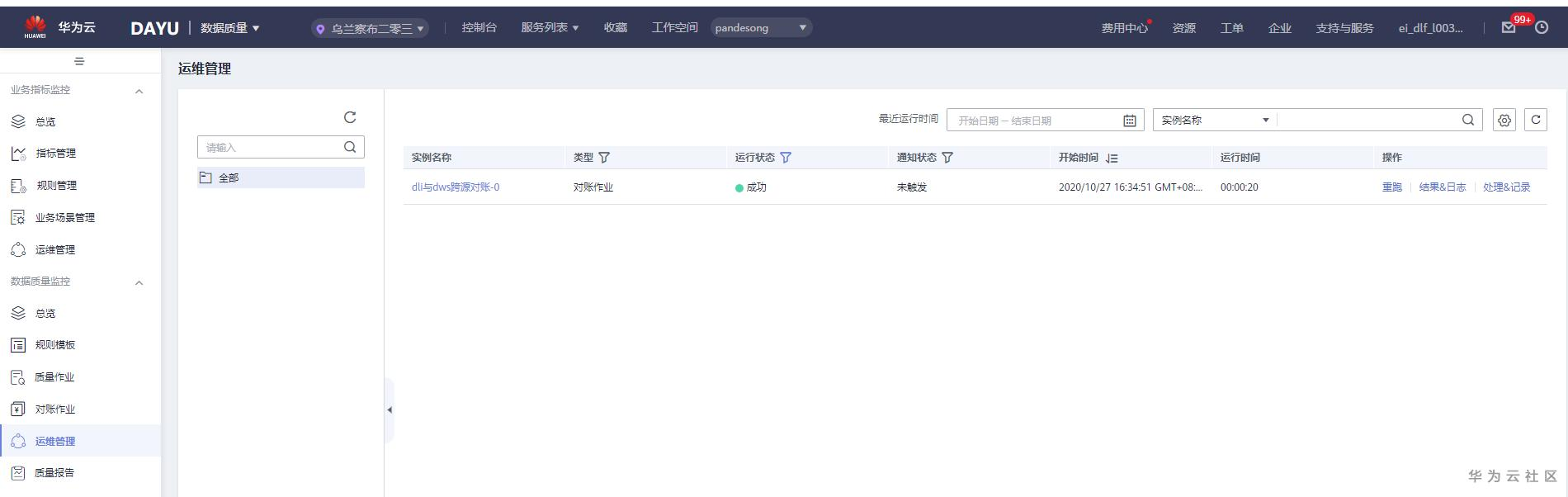 至此,完成了通过DAYU数据质量模块中的对账作业功能实现了DLI和DWS两种不同数据源中的表行数一致性对账功能。