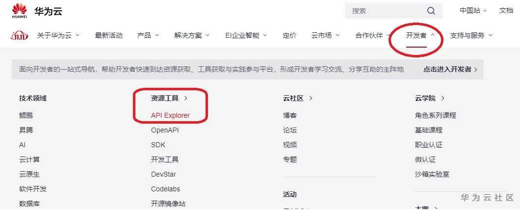输入https://www.huaweicloud.cn/,打开华为云,选择“开发者”=>“资源工具”下的API Explorer,查看华为云所有开放API: