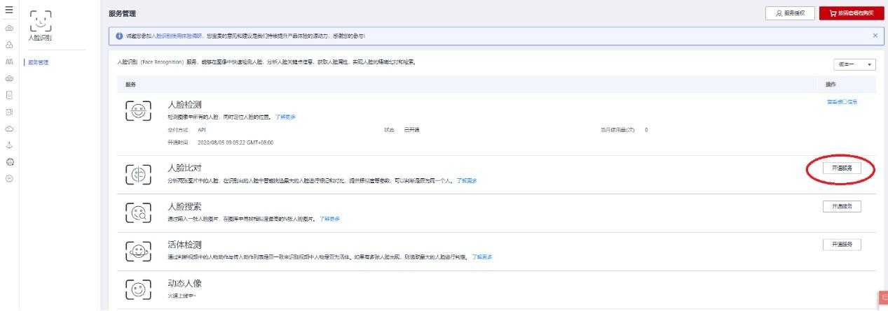 迫不及待调试一把,登录华为云(没注册的赶紧注册下),选择到人脸识别控制台页面(https://console.huaweicloud.cn/frs/?region=cn-north-1#/frs/home),开通人脸比对服务: