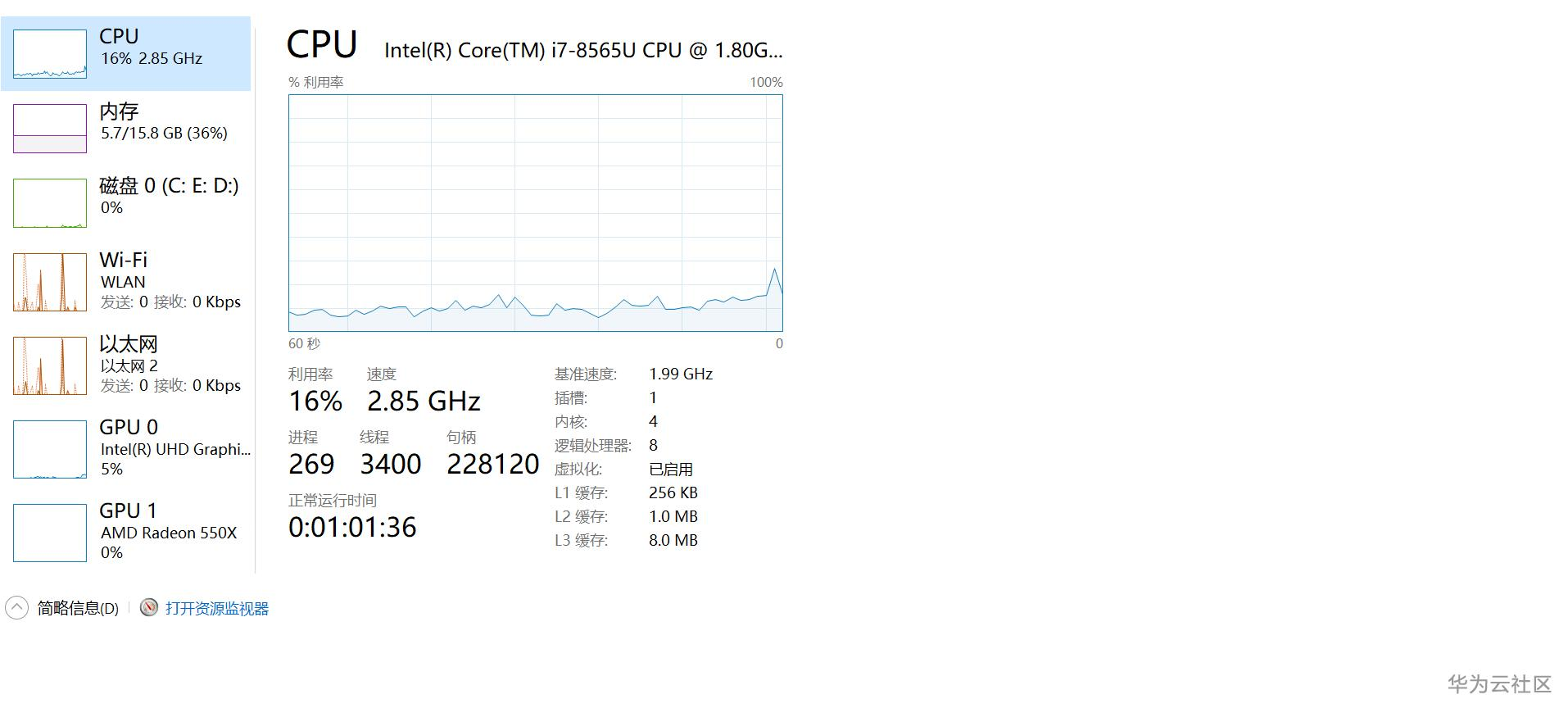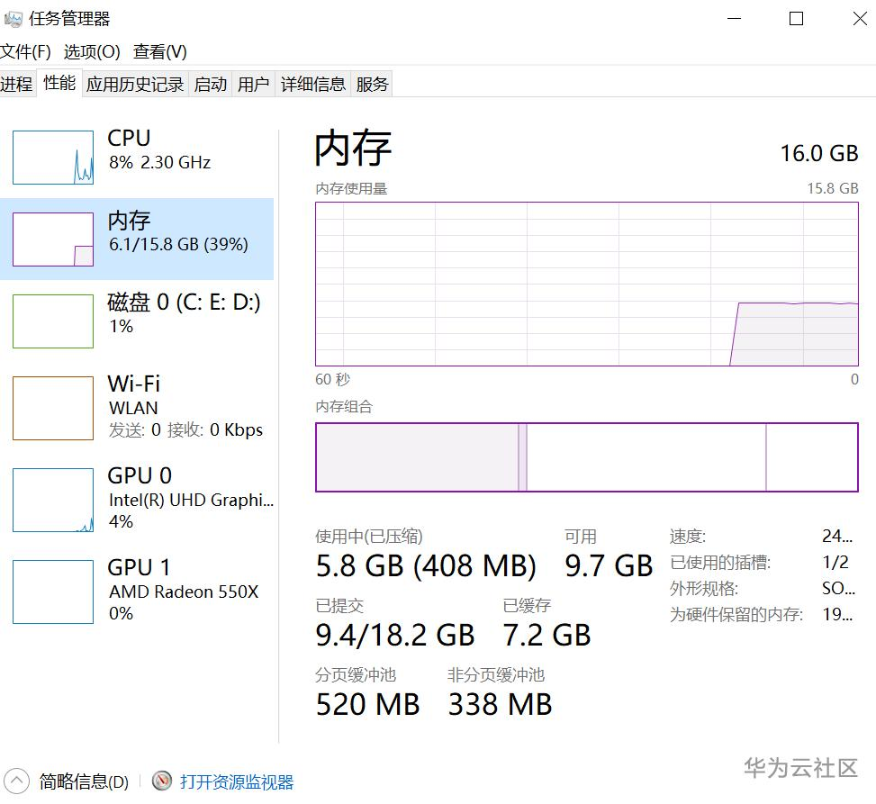 我这边的图上,有2个GPU,就是双显卡,一个是独显,一个是核显。我从不开独显。因为内存足够大,又不打游戏。
