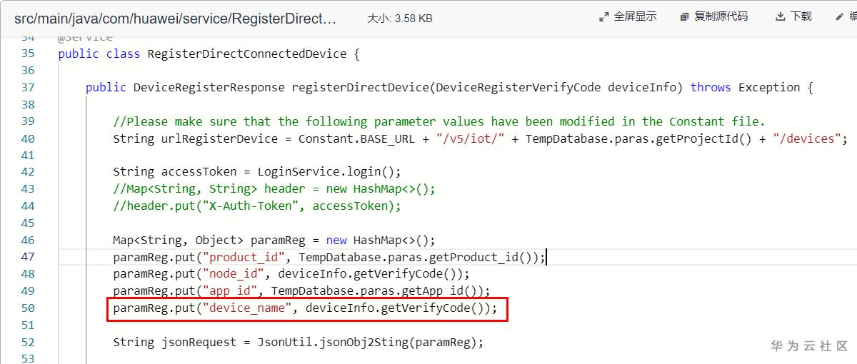 ① 修改src/main/java/com/huawei/service/RegisterDirectConnectedDevice.java,添加如下代码。