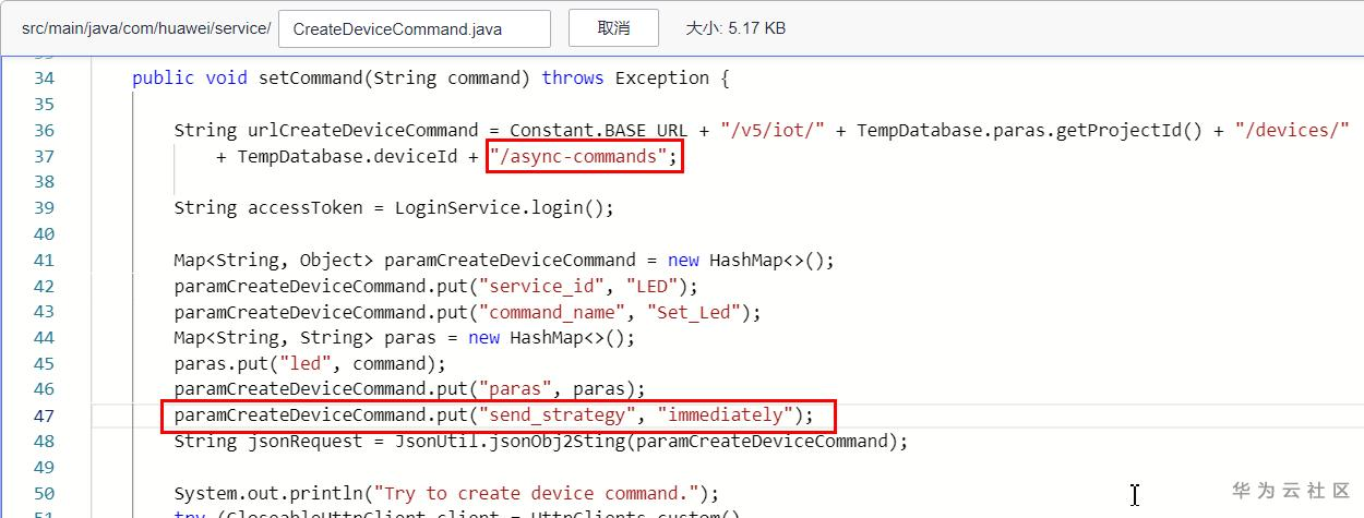 ② 修改src/main/java/com/huawei/service/CreateDeviceCommand.java,变更及添加如下代码。