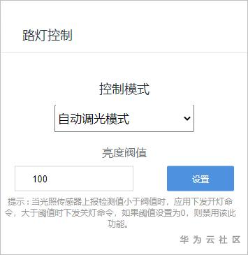 5、“路灯控制”选择“自动调光模式”,设置亮度阈值为100。