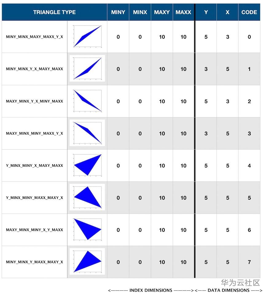在上图中,“code”维度表示哪些顶点与原始边界框共享,以及如何从最小/最大边界框索引维度和y、x数据维度重建剩余顶点。例如,在第一行中,代码维度“0”表示三角形与边界框索引维度共享(Ymin,Xmin)和(Ymax,Xmax)顶点。第三个三角形顶点可以直接用Y和X数据维重建。通过这种编码,可以使用总共七个维度有效地索引细分的三角形,使得BKD数据结构被组织为一个R树,该R树是空间搜索的最佳选择,同时能够从少量辅助数据重建三角形的原始顶点。