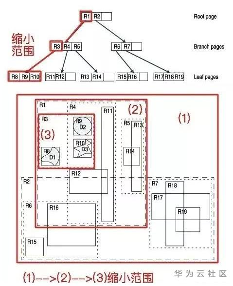 R-树采用一种叫做MBR(Minimal Bounding Rectangle)最小外界矩形,其中的R就是指的Rectangle矩形的意思,从叶子结点开始用矩形(Rectangle)将空间框起来,结点越往上,框住的空间就越大,以此对空间进行分割。R-树是处理空间数据的B+树的改进,它像B+树一样,是一个高度平衡的数据结构,现已成为空间数据库索引中应用最广泛的算法之一。