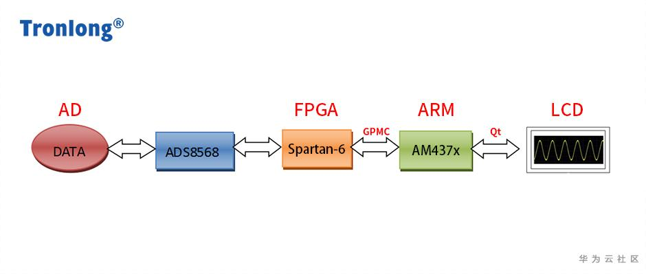 Spartan-6 FPGA通过ADS8568进行AD数据采集,并将AD数据通过核心板内部与ARM端连接的GPMC高速并行接口传送到AM437x ARM。ARM端运行Qt程序,将从GPMC接口读取的AD数据进行波形显示。