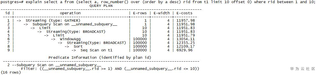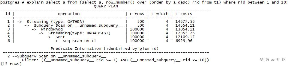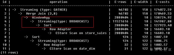 计划中第4层将所有DN的数据广播到一个DN上进行全局排序,并计算sum窗口函数的值,导致性能瓶颈。对于类似情况,在语义允许的情况下,尽量给窗口函数增加partition by的字段,这样分组计算时,GaussDB(DWS)可以将计算分配到不同的DN上进行,提高执行效率。